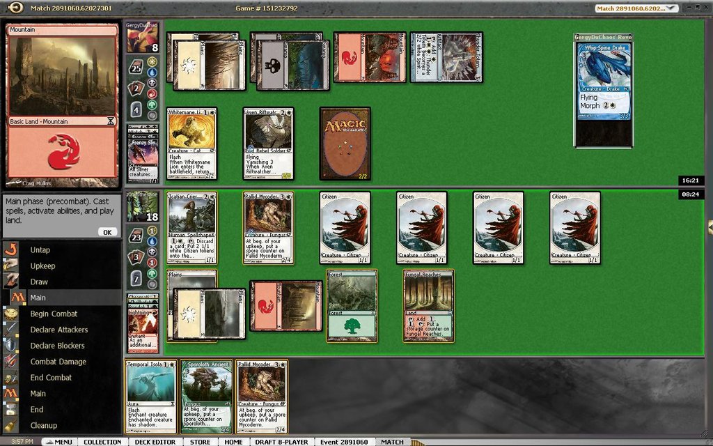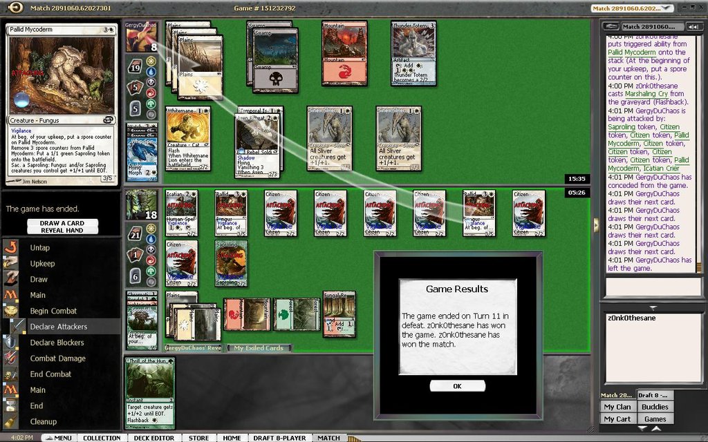 We cast Isolation on the 2/3 flyer, and swing in with just the Mycoderm. Why? Honestly, I didn’t see the flashback until later. This mistake happens more often than anyone will care to admit, so watch for it in Innistrad. In any case, he chumps with the face-down Drake, untaps to play a couple of Slivers, and passes the turn. We discard the Ancient for Soldiers, untap and draw Marshaling Cry. 3/3 slivers make our attacks a bit worse, so we hold off for one more turn, casting another Pallid Mycoderm and waiting ’til his end step to cycle the Cry, at which point we untap and win.