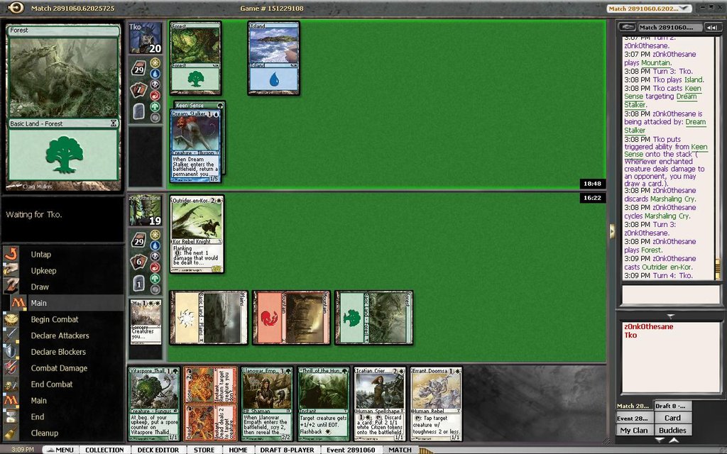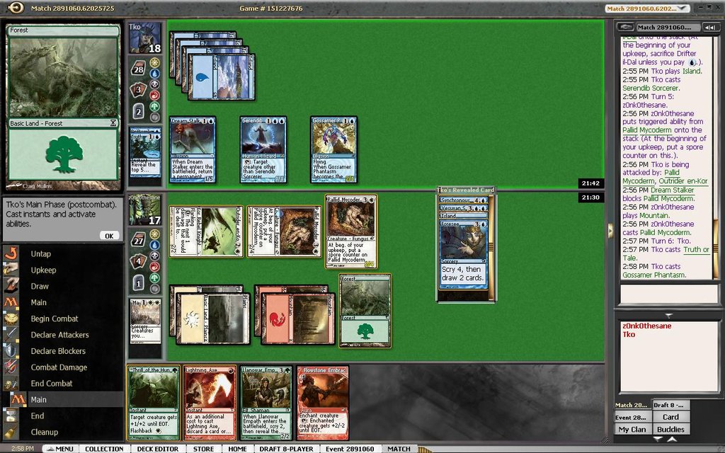 Firstly, he’s playing Dream Stalker. While there are some cards that benefit from being able to be replayed, the fact remains that he played it as his first non-land. None of my creatures particularly care about a 1/5, but they certainly don’t mind setting the opponent back a land drop. Also, Truth or Tale is just bad. Without working out the math behind comparing a deeper dig with less selection, the simple truth to this tale is that the other player has now seen five cards of your deck, one of which is now in your hand. Couple that information with the privilege of choosing the piles, and you’ve handed over a significant degree of control, and for what? A cantrip? And Gossamer Phantasm is no Phantasmal Bear. Even with the Auras, M12 just didn’t have that many targeting effects, whereas TPF has flashback and pingers/tappers galore. Not to mention that a bear in that format is much better than a 2/1 flyer in this one, and that 1 mana is a long way from 2.