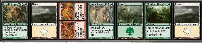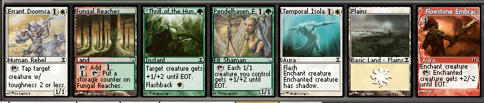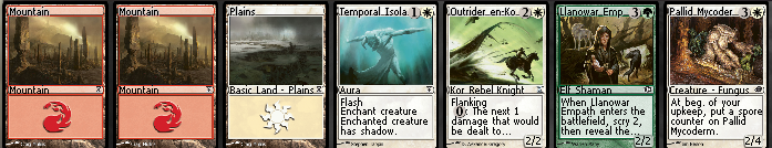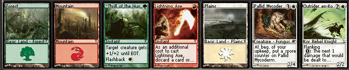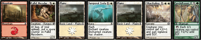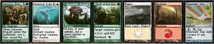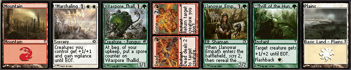 I like this deck. With seven cards that produce saprolings and six that boost all of them at once, it has a definite and consistent game plan. It’s important to note that the Pallid Mycoderms only pump fungi and saprolings, so the Crier won’t benefit. Still, two Marshaling Cries and the Pendelhaven Elder will make it quite good. Aside from those core fourteen cards, we have the excellent Thrill of the Hunts as combat tricks, some fixing from a Chromatic Star, and a handful of value creatures on the side (Llanowar Empath feels a bit like Foresee in that it costs 4, lets you scry, and often draws two cards). Fill in the deck with some nice red removal, and there you go.