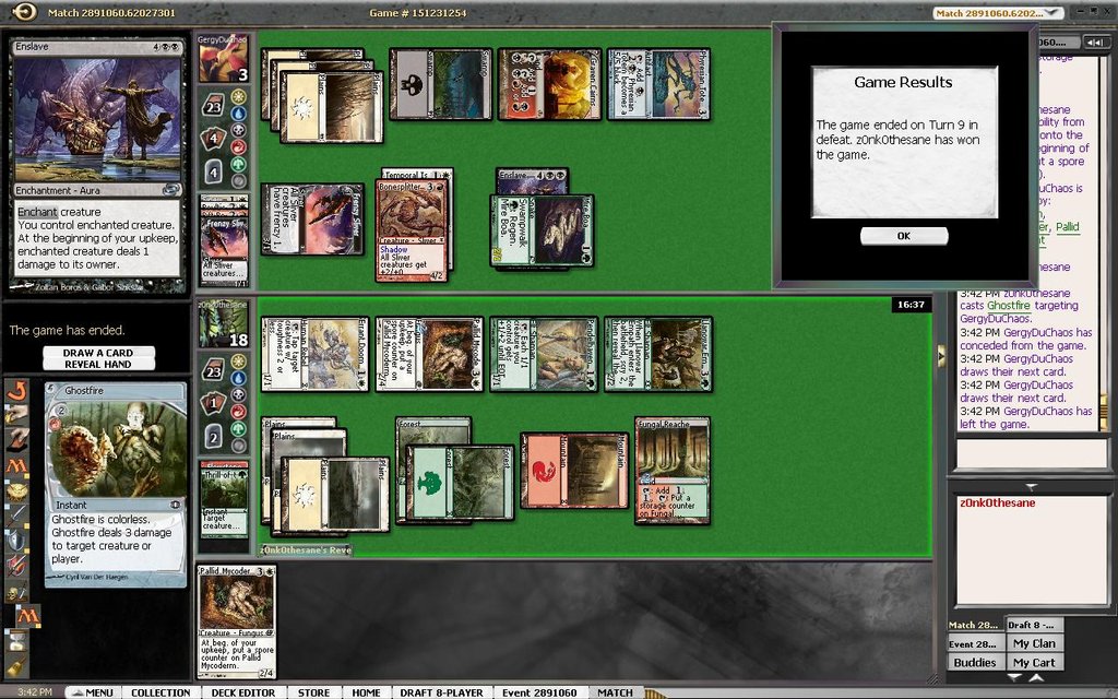 It turns out that our opponent is playing what looks to be a decent Sliver deck, but he stumbles on mana longer than we do, to the point that Enslave is just barely noteworthy.
