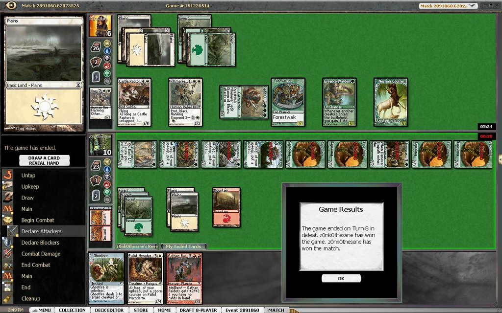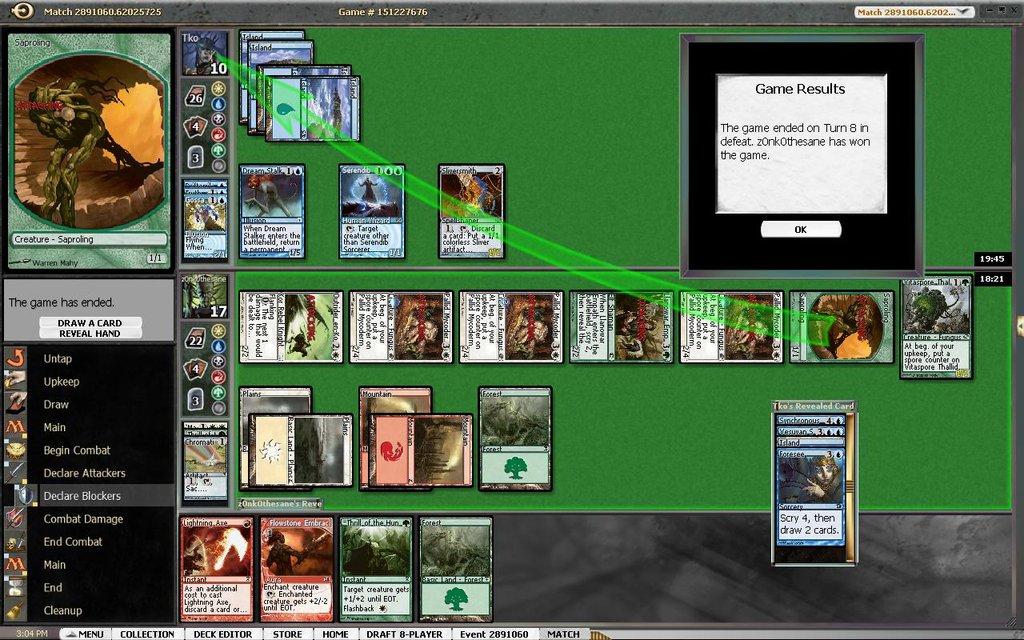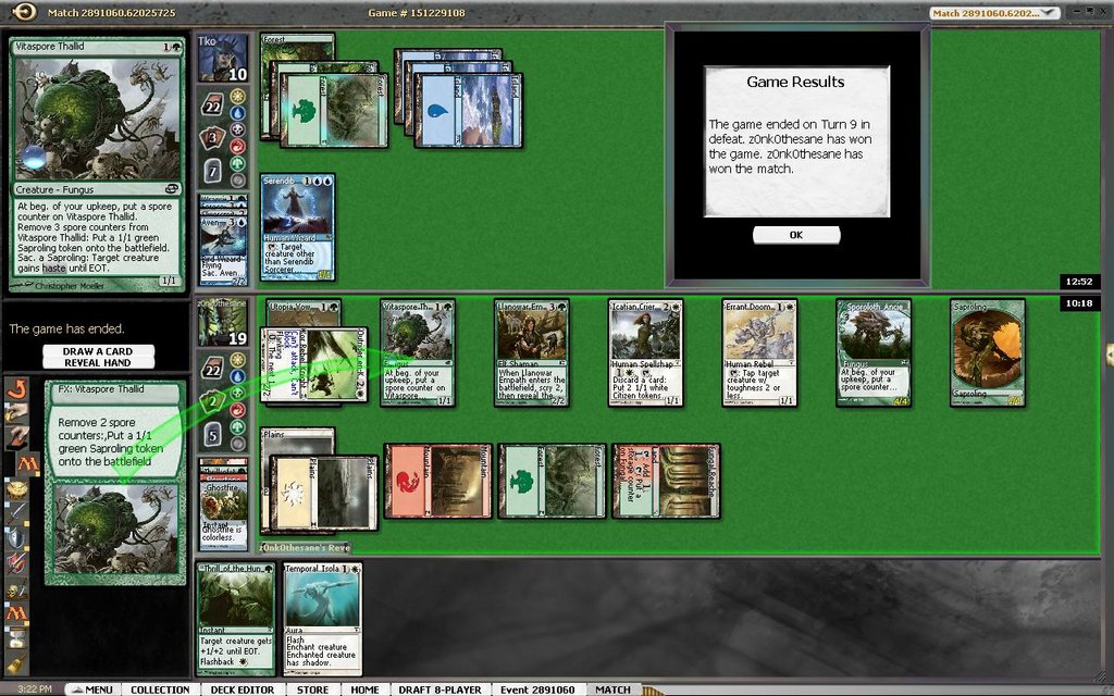 To be honest, there were a few decisions in the course of this match, but none of them seemed to matter. It was really just a matter of picking out the best way to finish it, and our opponent seemed to agree as he conceded the match at 10 life. Even with a few missed land drops on our side, it just wasn’t a contest. See for yourself: