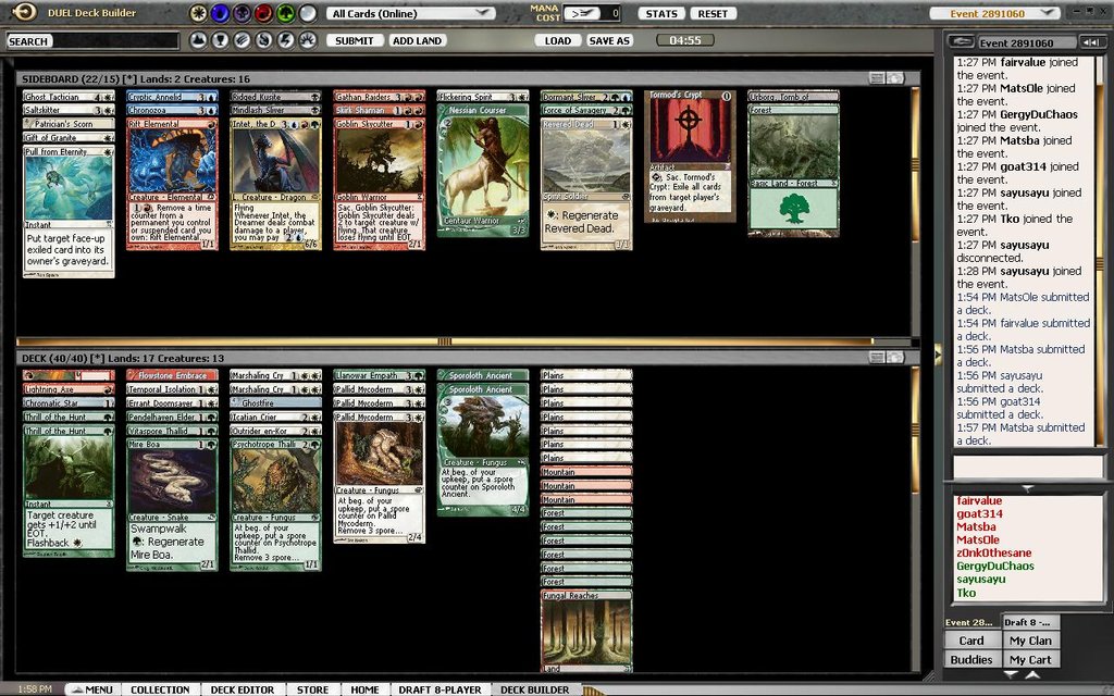 And then there’s Gathan Raiders. I’ve got nothing for that one. Honestly just didn’t see him, which highlights one of the greater strengths of that card: he’s very difficult to see coming, as you don’t really need to play Mountains to play him. I switched him in just about every chance I got, usually for one of the value creatures; Mire Boa if the opponent wasn’t playing Swamps, Outrider if he was.