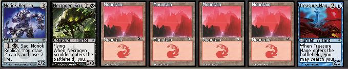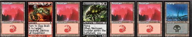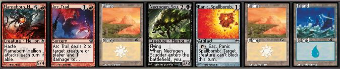 Much better. In fact, almost strictly better. The question that should be asked when considering a mulligan is: does this hand have what it takes to win? In this case, the answer is a solid “yes”. We have a powerful, card advantage-generating removal spell (I will keep almost any hand that involves an Arc Trail and a Mountain), a win condition, a cycler, and three lands of different colors. Proper mana and balanced spells are the key to a successful line of play.