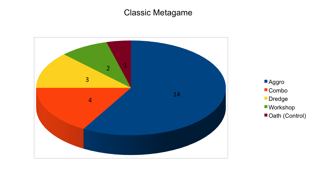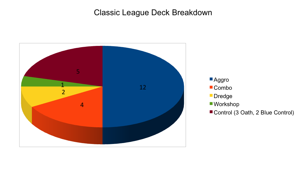 It’s impossible to definitively answer this question without having seen each and every deck in each of these tournaments. The Classic League decklists were posted in their entirety, however. For the 24 decks that participated in the Classic League, here is the breakdown of the total metagame:
