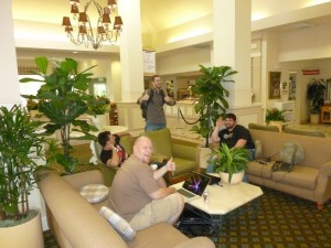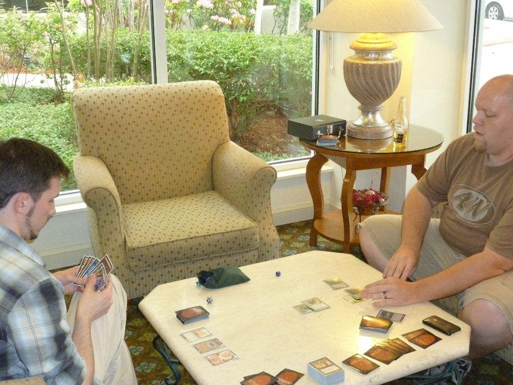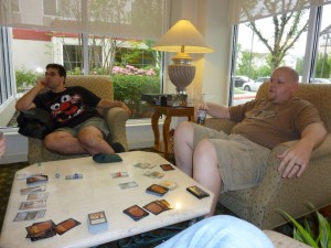 I landed in Seattle at around 10:30 AM local time and immediately made my way to the hotel. We where all stationed in the Hilton Holiday Inn which was literally a “Stone’s Throw” away from Wizards of the Coast and made it easy to walk back and forth when needed. I checked in left my luggage in the room and went back to the lobby to check for a convenient place to have some food. The first person I met there was Nate Price who was killing time by sitting on the couch in front of the fire place and playing Civilization IV. We started chatting for a while when we both decided it’s time to get some food and prepare for the first meeting with the WotC crew. Nate just came back from a long trip from Japan and was a bit tired, but excited for the events that would unfold. A while later more and more Community Cup participants joint and shortly after we where already battling – with Magic cards of course!