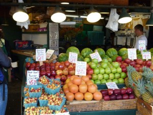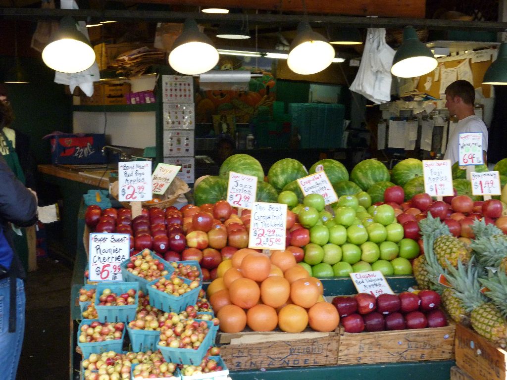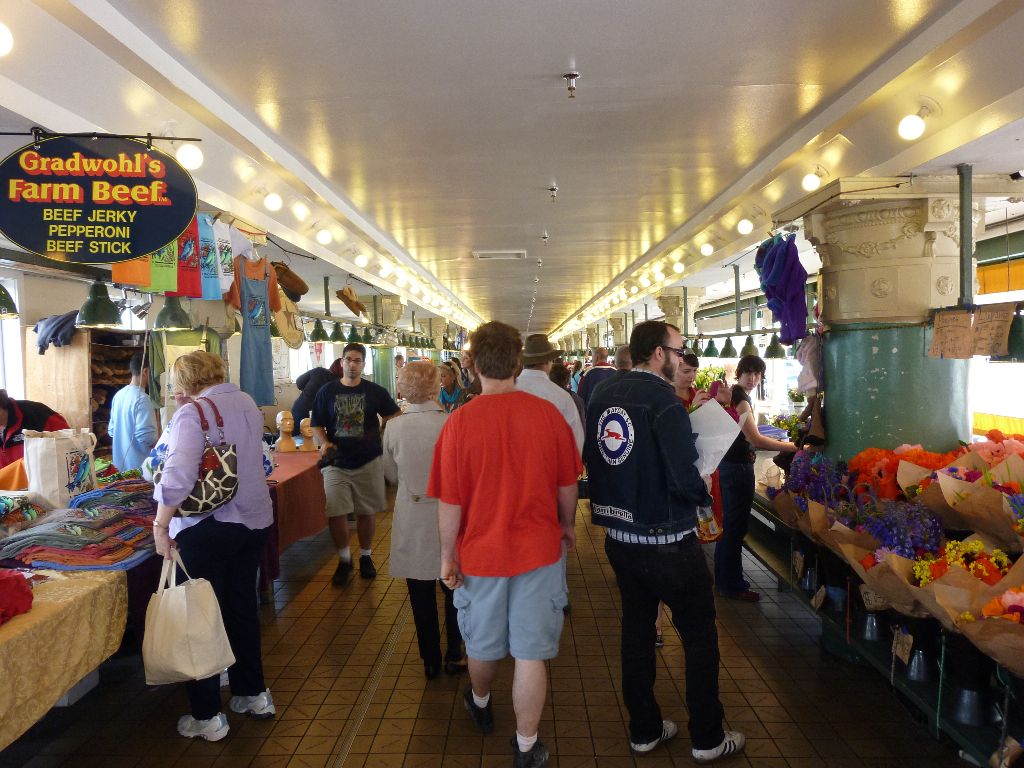 The Market is built on the edge of a steep hill, and consists of several lower levels located below the main level. Each features a variety of uniqueshops. Antiquedealers,comic book sellers, small family-ownedrestaurants, while the area contains one of the few remaininghead shops left in Seattle. The upper street level containsfishmongers, freshproduce stands and craft stalls operating in the coveredarcades. Local farmers and craftspeople sell year-round in the arcades from tables theyrent from the Market on a daily basis, in accordance with the Market’s mission and founding goal: allowing consumers to “Meet the Producer.”