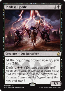 Wrapping up our set review, we have this pair of 5-power creatures. There seems to be a subset of Legacy players, like myself, that can’t help but see any oversized creature that costs 2C and immediately start thinking “Turn 1 City of Traitors, Chrome Mox, BOOM!” I have written at length in the past about these Chalice of the Void “Stompy” decks. Usually built to be a single-color, the most successful historically has been the red variant, which has seen some recent success thanks to Goblin Rabblemaster. The other colors have their own variants that have been built around such antiquated creatures as Exalted Angel, Serendib Efreet and Sea Drake. Black has always been a bit deficient in this archetype, so the appearance of a 5-power creature at 2B with a manageable drawback is worth considering. With only 3 toughness, you likely would prefer to have Chalice out first to protect it from Lightning Bolt. Five power is a critical number, as it lets you close out the game in just 4 hits. These decks often combine Chalice with Wasteland and taxing effects. Going black with this archetype allows you to consider Nether Void, the grand-daddy of all taxing effects, which should seal the deal if you land it with the Pitiless Horde in play.