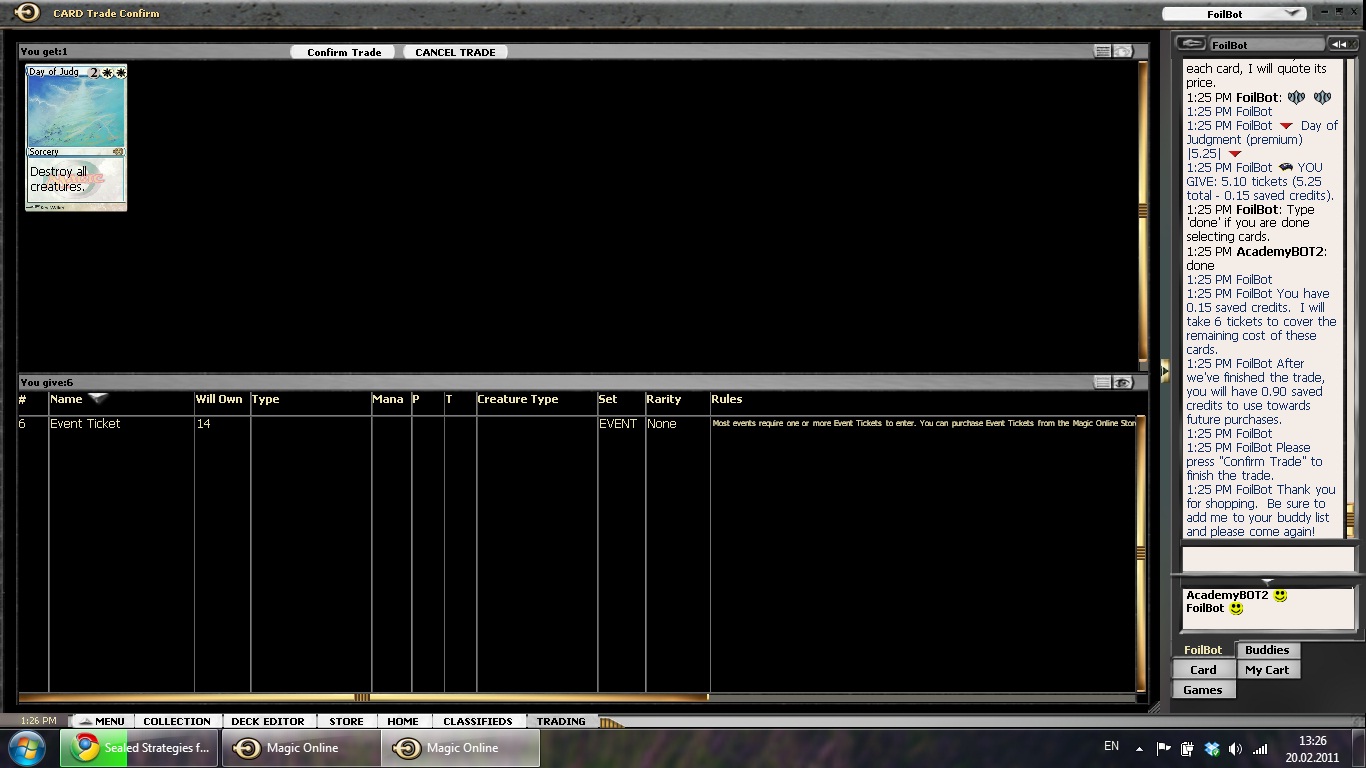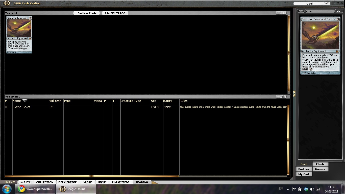 As the new set was already out, it made sense to buy and sell cards while they are changing values quickly. Of course, it is easy to burn your fingers, but usually it is possible to spot good opportunities. One of them was an ad selling Sword of Feast and Famine for 10 tickets! The card is an important component of the currently strong CawBlade deck and should stay a staple for a long time to come.
