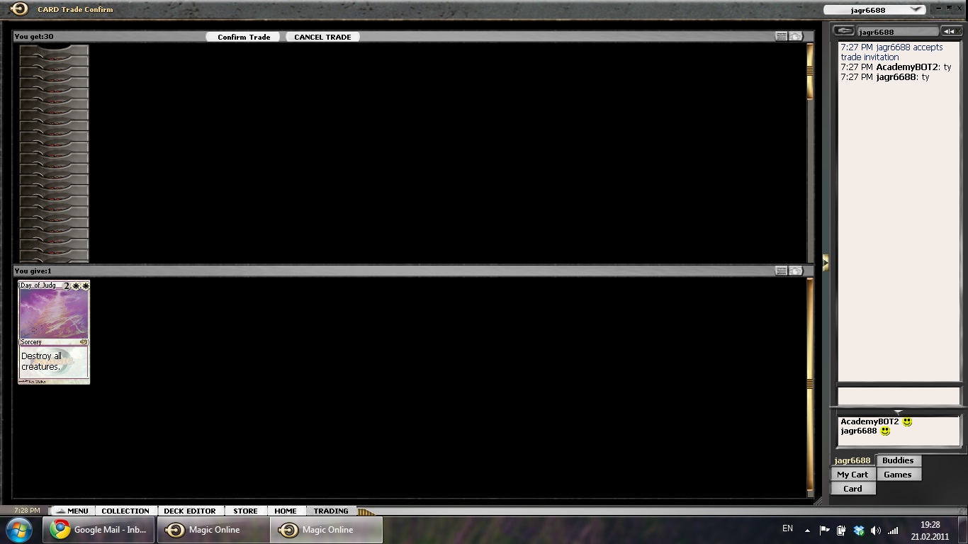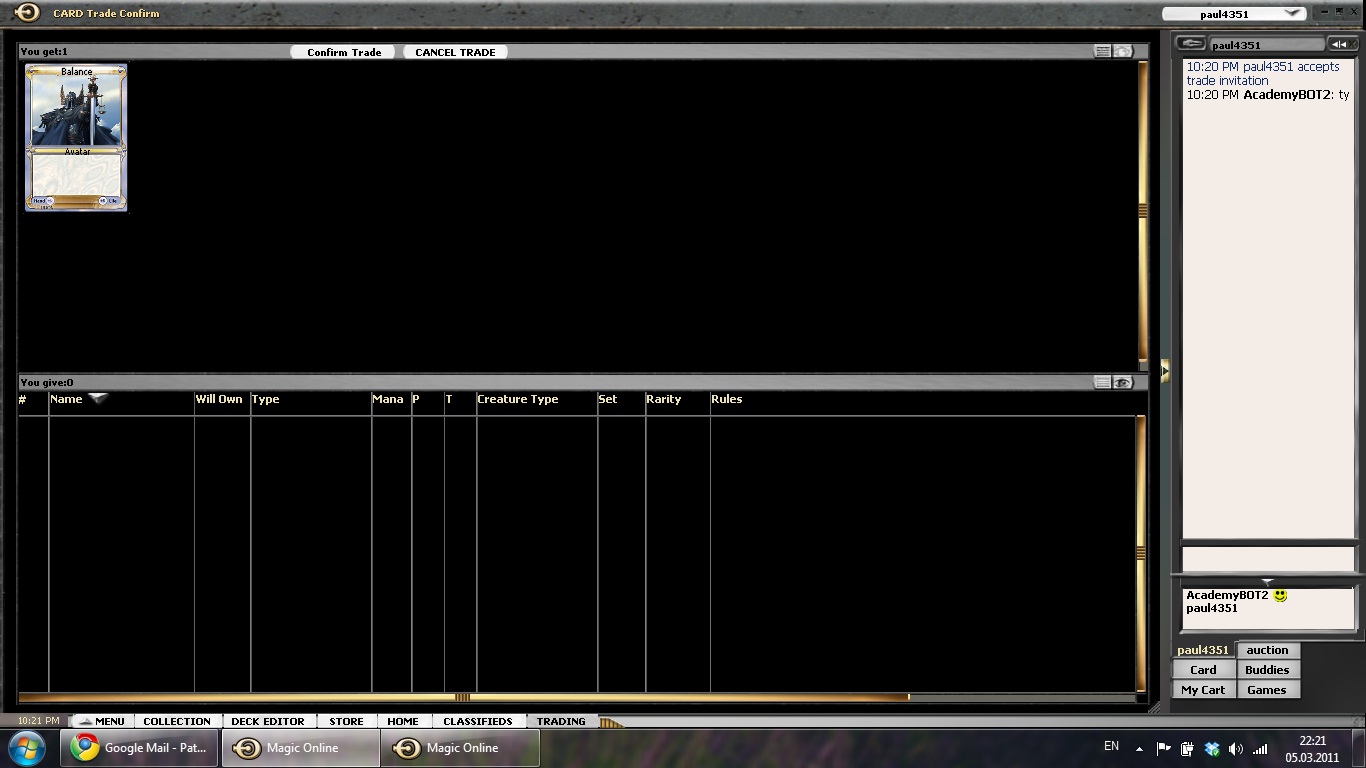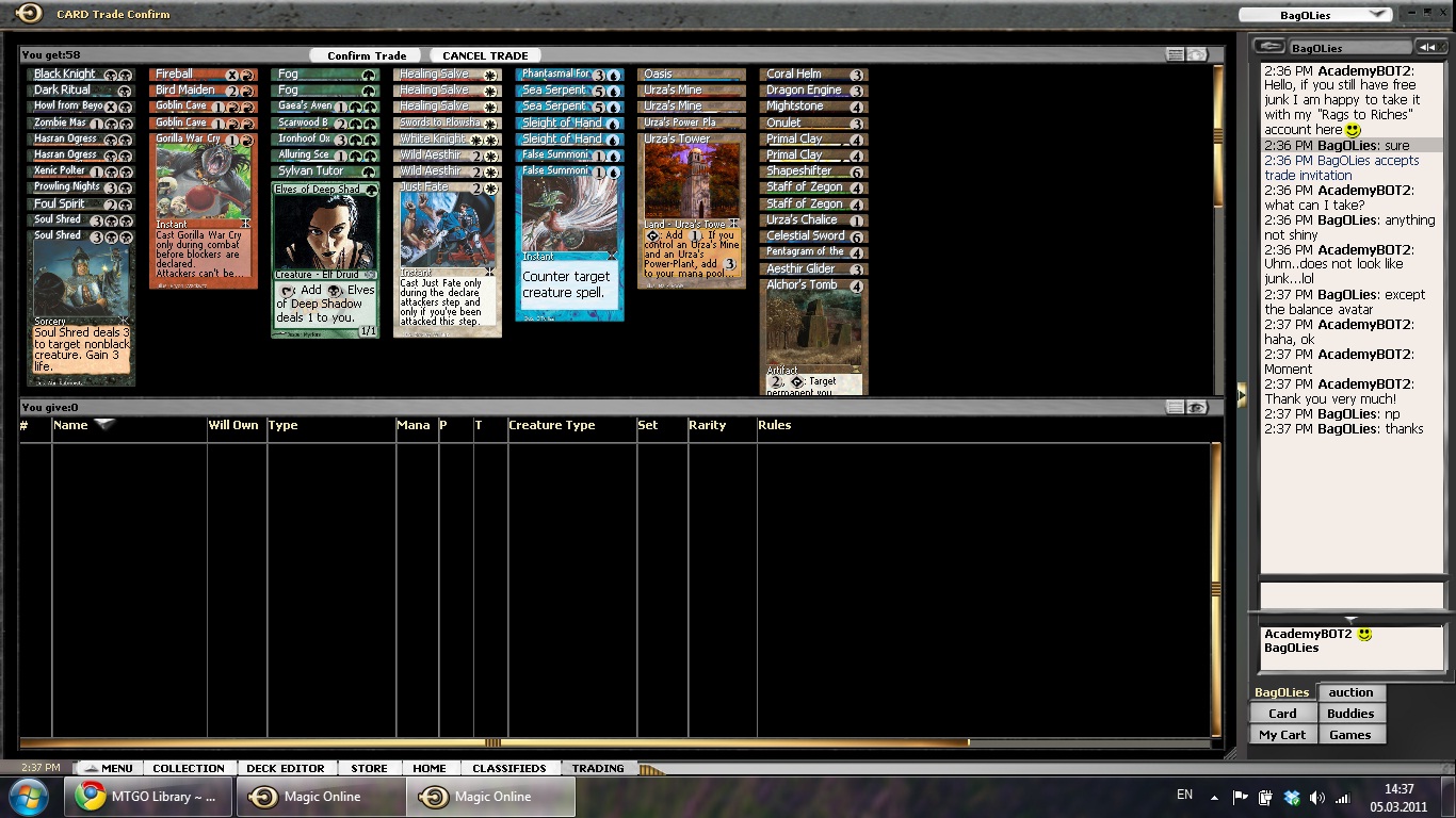 @Peter @Zage: I think I have to clarify here – I did not receive the free cards because of my Rags account. All of the people that gave me the free cards where advertising that they give away cards either on classified or in the auction room. The first one was in fact in the process of tossing all his cards for free on a bot! It was therefore not something I got only because of my reputation and writer of this column. Was it lucky? Yes. Was it biased trading. No.