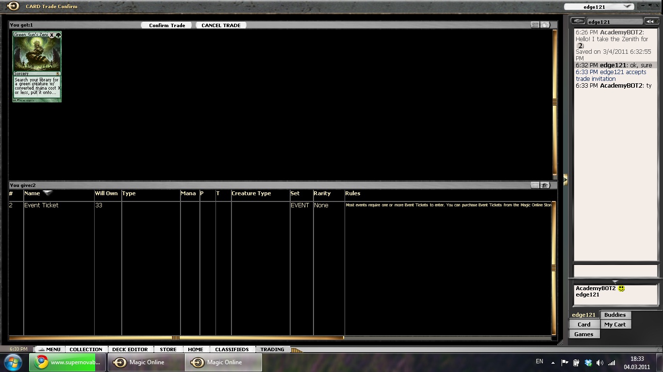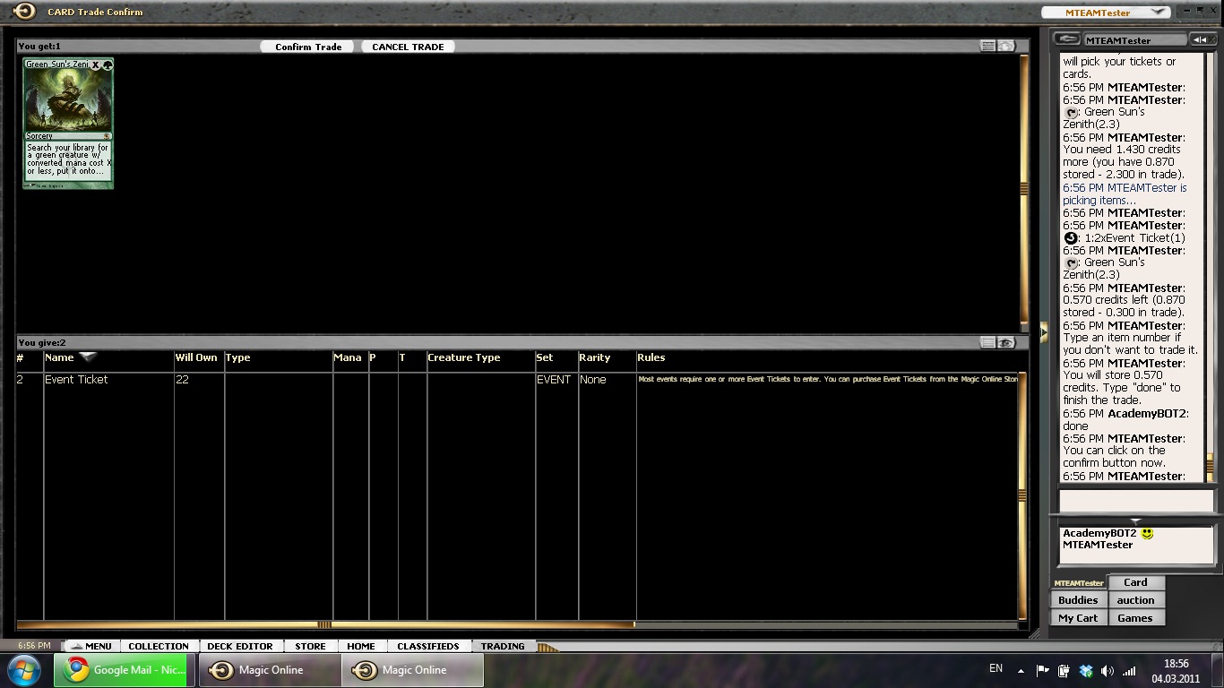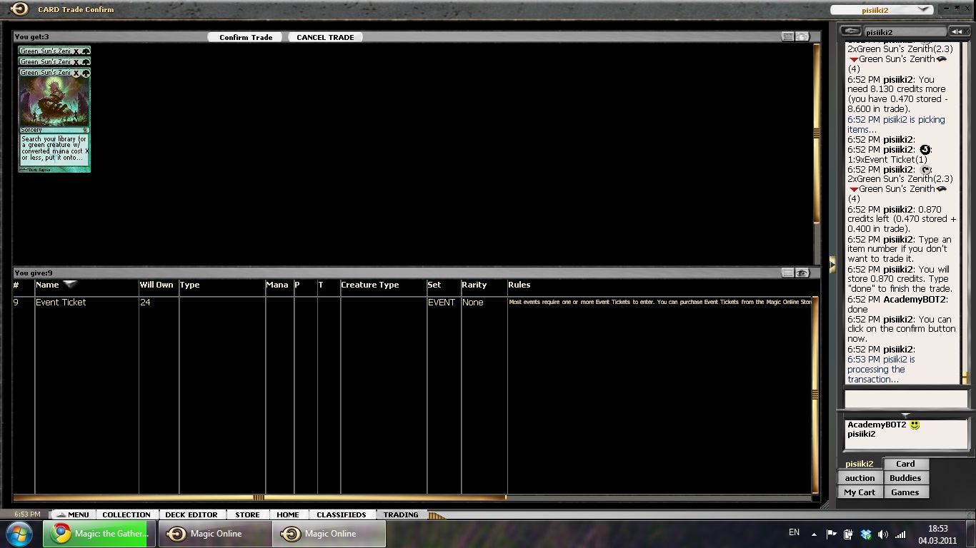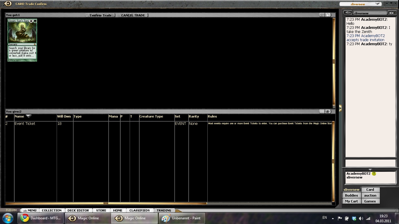 I bought a total of 10 Green Sun’s Zenith, one foil, for around 22 Tickets and hope that it will reap some reward. It is always a certain risk to put in a huge amount of your resources into one card, but in this case I just hope that the overall strength and versatility will keep demand high and make the price rise. Finally, I was able to get more free cards from a fellow player that wanted to get rid of junk and a free Balance avatar from another that had too many of those.