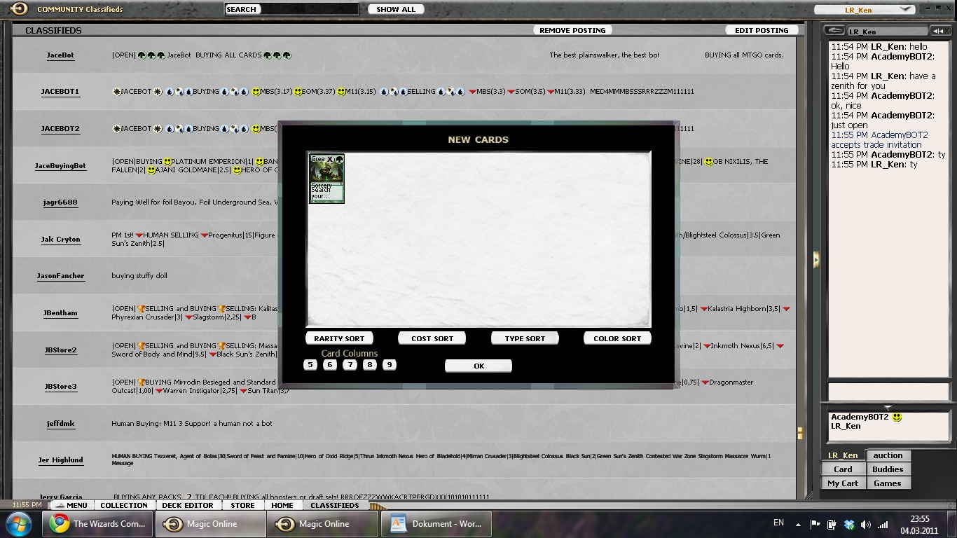 While waiting for a buyer, I scanned the Classifieds section and saw a post from a user that was giving away free cards – no need to mention that twice! I contacted him, and he said he was just about to get rid of them on a bot that takes cards for free! I opened trade and got all(!) cards he still had left. That added about 1200 commons and 300 uncommons to my account (only showing screenshot of one trade).