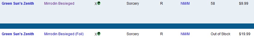 @Nero: I am using different sources to check for foils. CQ is one of them among the official Wizards page with the MOCS season information where you find out which cards are given out to the participants. Using other dealer pages to check for availability is also useful. juggernaut1002 is right that there is no general rule for transfering paper to online and vice versa. It really depends on a lot of factors and the price difference for standard cards can only be one indicator. In general you will see prices for online cards go up as soon as redemption kicks in. When this will happen for Mirrodin Besieged can probably be found out by asking an ORC in game.