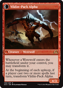 K: Transformation is such a prevalent horror trope that it was an absolutely brilliant move to nail down the way to capture it within the game for this block. Double-faced cards are kind of a hassle rules and gameplay wise, but boy oh boy is the flavor worth it. Most of the set’s biggest winners come from here, and it’s easy to see why. Each double-faced card tells a little story: The foolhardy ship brings something in the ice back to the port, and an unspeakable horror is loosed upon the town; A kindly stranger turns out to be a demonic witch; A Thraben Gargoyle comes alive, and evil can’t survive. The way werewolves transform is another little triumph. While it’s not a perfect match for the usual full-moon requirement, it feels cyclical and only partially in your own control. The in-game feel of these cards was always great in the original set, and they were well worth the baggage. It looks like more of the same here.