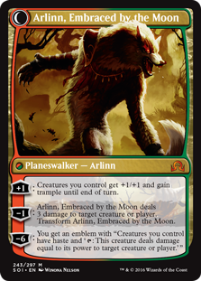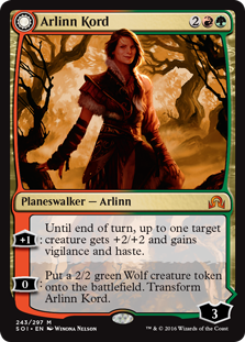 K: Here’s our most interesting planeswalker, mechanically speaking. By making her a werewolf walker, she gets to have different abilities in each of her incarnations. I have a hard time imagining her getting to that ultimate in most games, since the most reasonable path to it looks like it’ll involve mini-overrunning for several turns in a row. I don’t have much to say about Arlinn because I don’t really get a sense of her place in the story here. She seems like a good guy, but I’m basing that on the art.