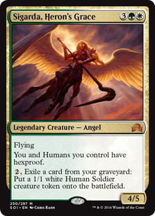 K: Sigarda’s our hero now, the only angel of the AVR trio willing to stand up to Avacyn now that she’s gone all blood-lust-y. You can tell that she’s selfless because she’s given up her previous career of being a good card in order to protect you and other humans. I get that you’d want her ability to make humans, but what exactly does exiling cards from a graveyard represent here? Is she making dead zombies and werewolves back into people? Is she an ingester? One thing that’s cool about this ability is that it cures your delirium, so maybe that’s what they’re going for.