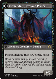 T: Ormendahl is the spiritual successor to Griselbrand‘s legacy of demonic troublemaking, but it looks like Avacyn’s really beaten him to the punch on all fronts. What do you do when you escape from imprisonment to wreak havoc on the righteous, only to find all of it already wroke? Does he team up with Sigarda now? Go back to sleep? Flay some abbots? Maybe he should check out Hearthstone…