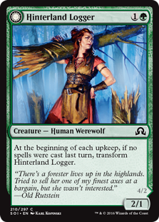 T: The double-faced cards are easily some of the best in the set. Even a random no-account common werewolf like Hinterland Logger tells its own self-contained story. In fact, I think if you count the front and back of the card, Hinterland Logger may have more lines of text written about her in existence than Arlinn Kord does.